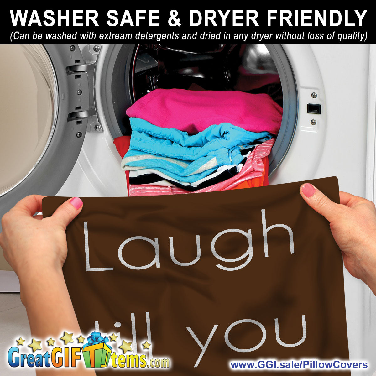 Every one of our throw pillow covers are 100% machine washable and dryer safe. They are guaranteed to never bleed, fade or flake off onto the rest of your clothes, even on the first wash.